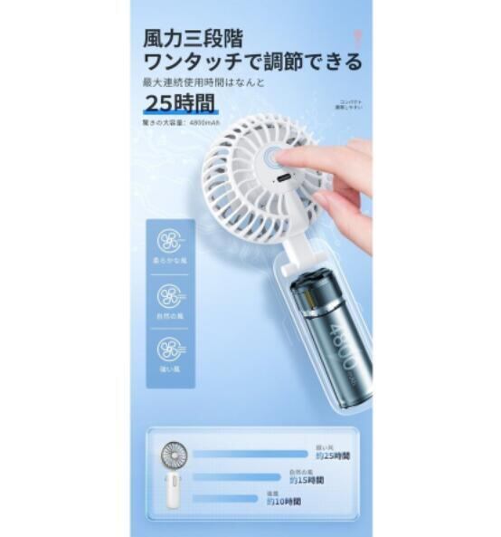 このハンディファンは、手軽に使えるサイズ感ながら、強力な風を届けます。USB充電式で、移動中やアウトドアでも便利に使用可能。デスクワークやレジャー、散歩の際にも役立つことでしょう。また、静音設計なので、周囲に気を使わずに使用できる点も魅力的です。