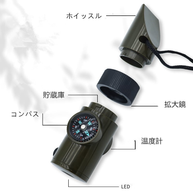 このホイッスルは、強力な音量で周囲に発信することができ、緊急時に非常に効果的です。また、LEDライト付きで、暗い場所でも視認性を確保。さらに、羅針盤(コンパス)も内蔵されており、方向を確認することができます。軽量でコンパクトなデザインのため、持ち運びも簡単で、バックパックに入れておくのにぴったりです。